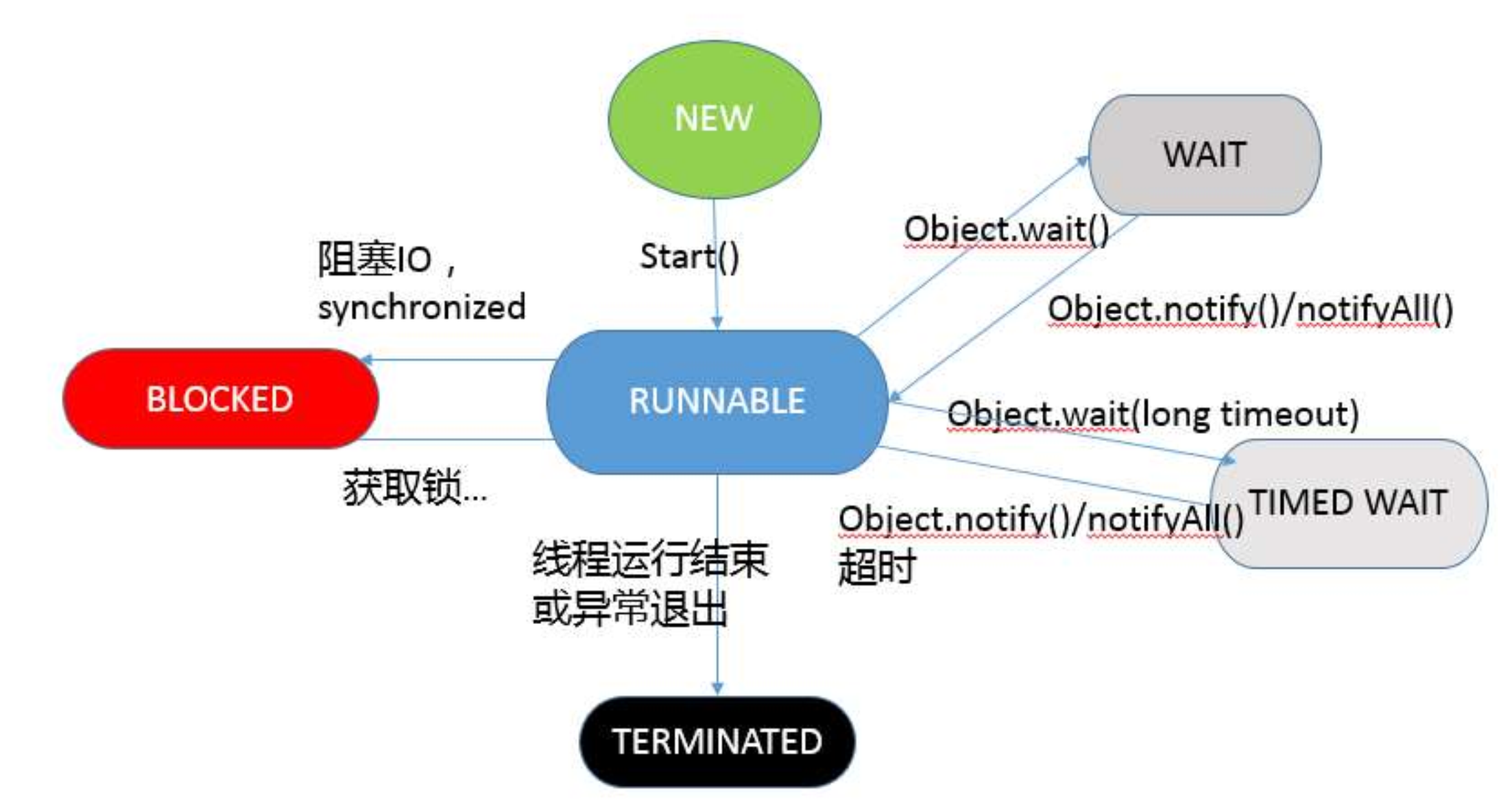 调用wait进入waiting;被其他线程notify同时线程还没出synchronize代码块时则进入BLOCKED状态 wait和notify