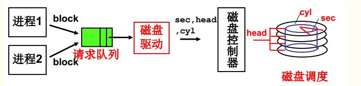 第二层抽象:通过队列访问磁盘,由磁盘驱动调度(电梯算法,从一端到另一端,圆形循环)