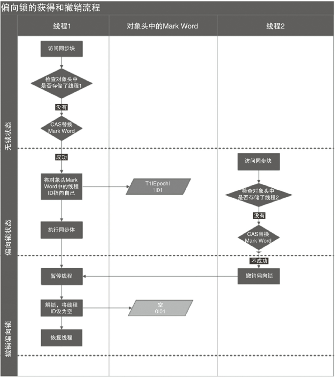 程1演示了偏向锁初始化的流程,线程2演示了偏向锁撤销的流程。