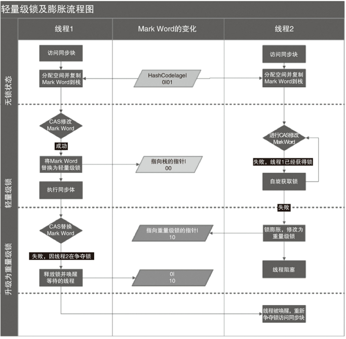 功,则表示没有竞争发生。如果失败,表示当前锁存在竞争,锁就会膨胀成重量级锁。图2-2是