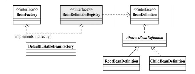 当客户端向BeanFactory请求相应对象的时候,BeanFactory会通过这些信息为客户端返回一个完备可用的对象实例。RootBeanDefinition和ChildBeanDefinition是BeanDefinition的两个主要实现类 - BeanDefinitionRegistry (接口定义抽象了Bean的注册逻辑)