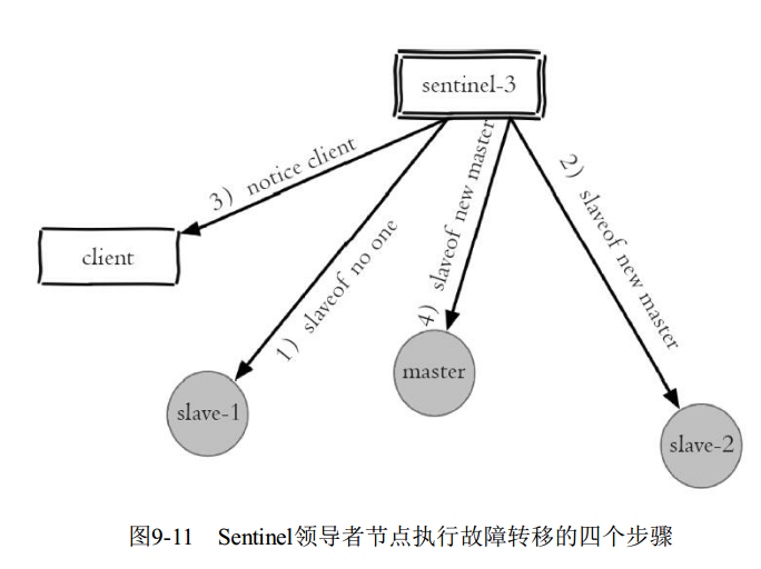 - 多个Sentinel节点对主节点的故障达成一致, 选举出 sentinel-3节点作为领导者负责故障转移