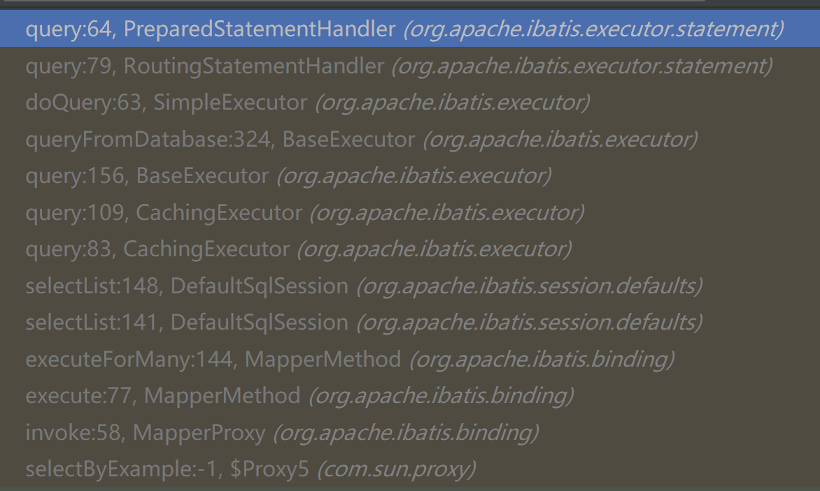 List<E> query(MappedStatement ms, Object parameter, RowBounds rowBounds, ResultHandler resultHandler, CacheKey key, BoundSql boundSql)BaseExecutor做一级缓存,然后调用SimpleExecutor的doQuery(),少了CacheKey参数,