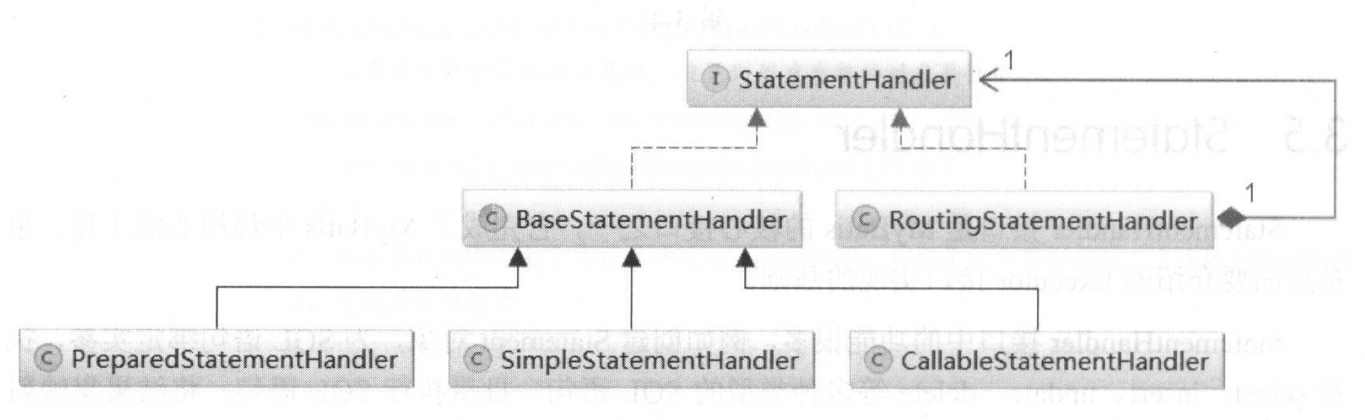 public <E> List<E> doQuery(MappedStatement ms, Object parameter, RowBounds rowBounds, ResultHandler resultHandler, BoundSql boundSql) throws SQLException { Statement stmt = null; try { Configuration configuration = ms.getConfiguration(); //创建出相应的StatementHandler StatementHandler handler = configuration.newStatementHandler(wrapper, ms, parameter, rowBounds, resultHandler, boundSql); //会调用handler.prepare() handler.parameterize() stmt = prepareStatement(handler, ms.getStatementLog()); return handler.query(stmt, resultHandler); } finally { closeStatement(stmt); } } - StatementHandler Executor执行doQuery()的时候已经创建出对应的StatementHandler,由RoutingStatementHandler静态代理, 这里由参数 用PreparedStatementHandler,最后调用jdbc的java.sql.PreparedStatement执行sql语句