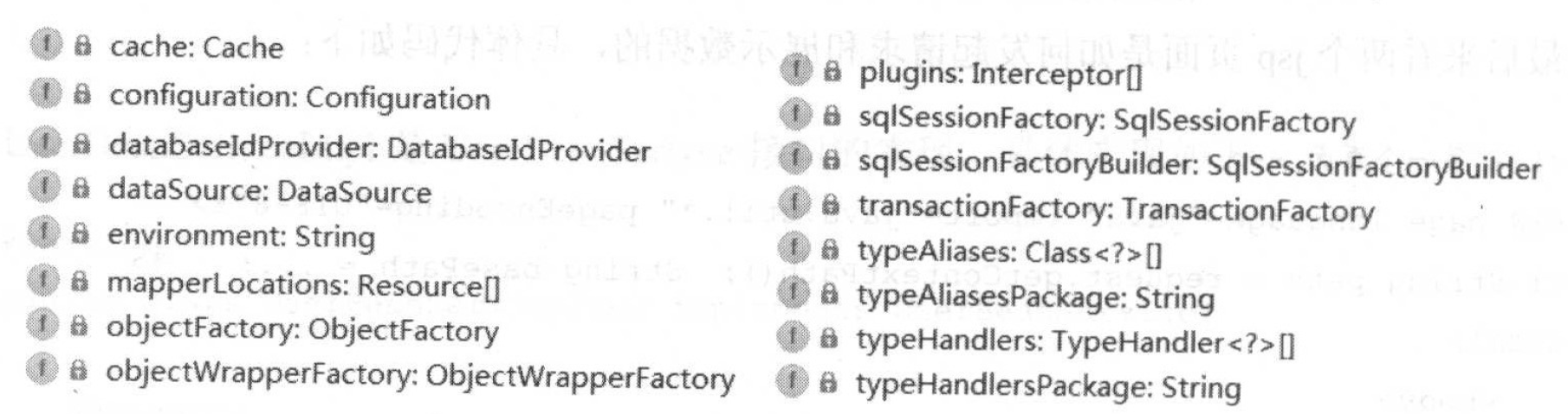 SqlSessionFactoryBean有下面这些字段,和Configuration都差不多,buildSqlSessionFactory()方法作用就是从原有的Configuration或者xml配置文件里构建Configuration,