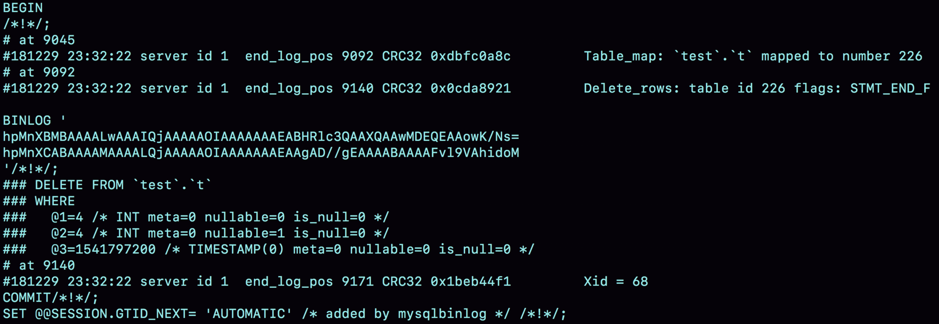 第三行就是真实执行的语句了。可以看到,在真实执行的delete命令之前,还有一个“use ‘test’”命令。这条命令不是我们主动执行的,而是MySQL根据当前要操作的表所在的数据库,自行添加的。这样做可以保证日志传到备库去执行的时候,不论当前的工作线程在哪个库里,都能够正确地更新到test库的表t。 use ‘test’命令之后的delete 语句,就是我们输入的SQL原文了。可以看到,binlog“忠实”地记录了SQL命令,甚至连注释也一并记录了。 最后一行是一个COMMIT。你可以看到里面写着xid=61。